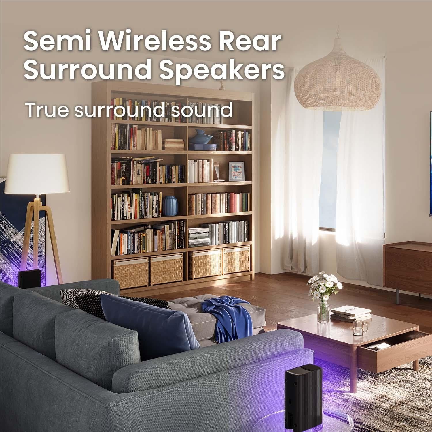 📶 Semi-Wireless Setup – subwoofer and rear speakers connect wirelessly, reducing cable clutter