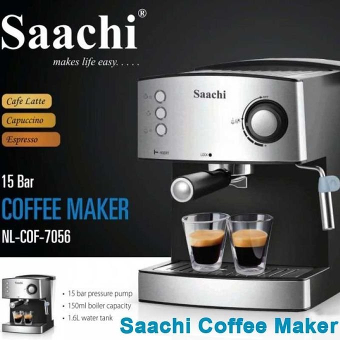 Saachi Coffee Maker prepares all types of coffee including espresso, cafe latte, and cappuccino. This all in one coffee maker has a steam nozzle to add froth.Make your coffee breaks more exciting with the Saachi Coffee Maker. With its steam nozzle, you can also add froth to your coffee and make it more appealing. All the more, you can make your coffee just the way you like, be it cappuccino, espresso, or cafe latte. The coffee maker features an automatic steam pressure pump of 15 bar and a transparent removable water tank of 1.6L. The warm tray on its top keeps your coffee hot when you are preparing more than just a few cups for your guests or friends. Enjoy sipping your delicious coffee that will refresh you and keep you awake.