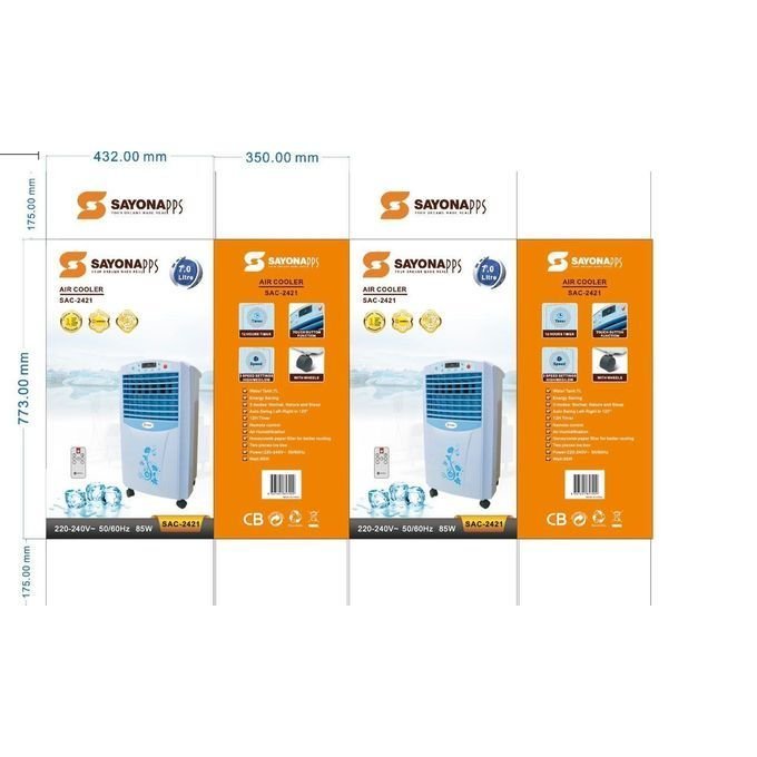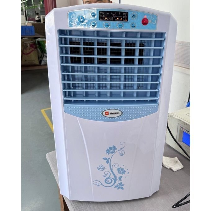 - Product Specifications: Sayona 7L Air Cooler comes with a remote for easy use and operates on AC 220-240V of power. Its honeycomb pad absorbs heat from the air causing the water to evaporate, so keep an eye on the water level indicator to keep the water tank full and clean.