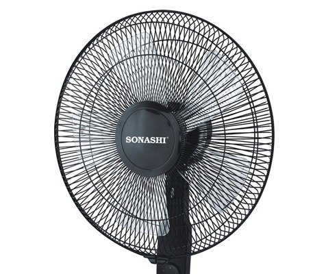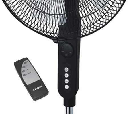 - Product Specification: The Sonashi stand fan with remote control measures 16 in. in height and comes in a sleek black colour. It works efficiently and produces a low noise as it operates on an in-built 60W copper motor.